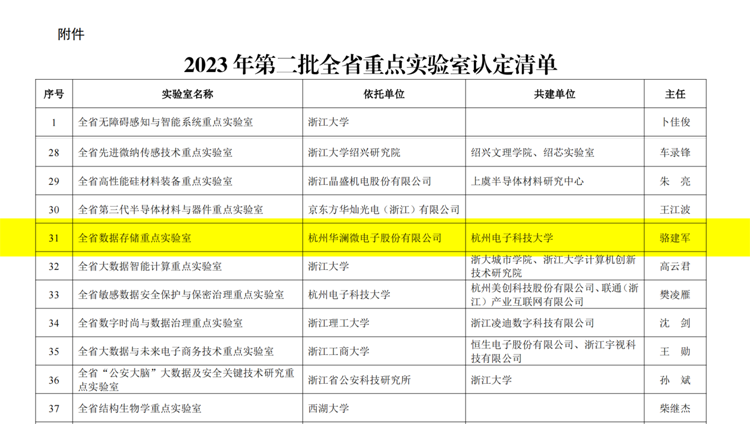 2024年7月25日?,浙江省科學技術廳公布了2023年第二批全省重點實驗室認定結果,由杭州華瀾微電子股份有限公司牽頭,聯合杭州電子科技大學共同建設的“全省數據存儲重點實驗室”通過認定,這是華瀾微電子在科技創新領域取得的又一重要成果,標志著公司在數據存儲科研平臺建設方面邁上了新的臺階。